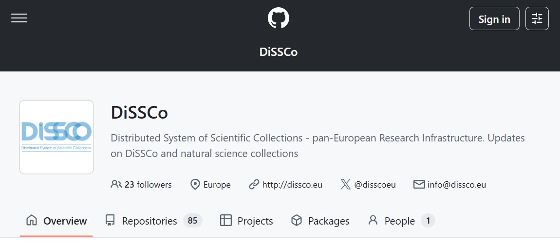 The DiSSCo GitHub is the primary repository of materials for developers of the DiSSCo Research Infrastructure. It includes concepts, codes, scripts, and support developed during preparatory projects that were used to build the European RI.